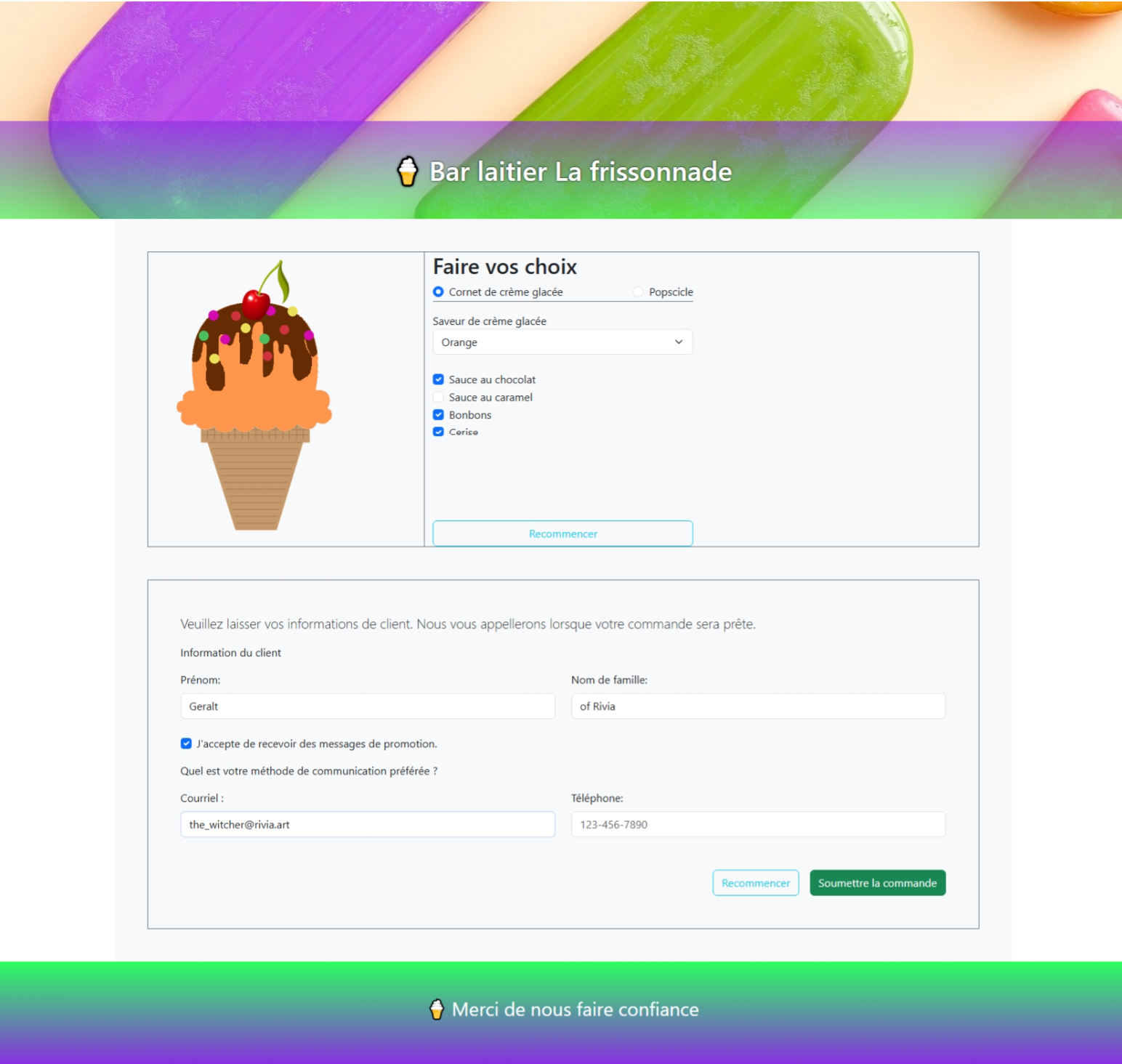 - Sur click du bouton, le formulaire se réinitialise, la zone d'image affiche le cornet vide, même lorsque le dernier choix était popscicle